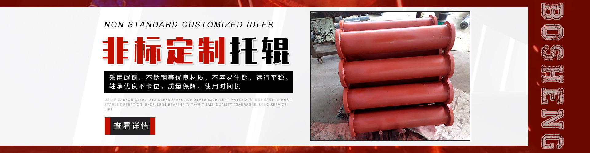泰安博晟礦山機(jī)械有限公司位于山東泰安新泰市汶南鎮(zhèn)陳糧村。緊鄰京滬、京福、萊新高速公路。公路交通極為方便,環(huán)境優(yōu)美。公司主要生產(chǎn):托輥、托輥配件、托輥支架等皮帶輸送機(jī)配件。歡迎各界商友前來洽談考察。聯(lián)系電話:13954880316. 泰安博晟礦山機(jī)械有限公司采用國際標(biāo)準(zhǔn)設(shè)計(jì)、制造技術(shù),將托輥的設(shè)計(jì)和制造提高到了一個(gè)更高的水平,生產(chǎn)的托輥具有小的旋轉(zhuǎn)阻力,長的壽命,小的維修工作量和高的承載能力。鋼管采用托輥專用高頻焊管,管內(nèi)做去刺處理,圓度控制在特殊的公差范圍之內(nèi)。軸是按標(biāo)準(zhǔn)公差加工的冷拉鋼制造。軸承座采用進(jìn)口冷扎鋼板經(jīng)多次工藝沖壓而成。托輥管和軸承座被自動焊接機(jī)械手焊接在一起,形成一個(gè)具有很高強(qiáng)度的整體構(gòu)造。托輥軸承采用國內(nèi)外知名品牌的大游隙深溝球雙密封軸承,使托輥具有理想的靜平衡和動平衡,其旋轉(zhuǎn)阻力優(yōu)于國標(biāo)。托輥密封采用綜合國外和國內(nèi)迷宮式密封的特點(diǎn)進(jìn)行了專門設(shè)計(jì),內(nèi)充耐高速高溫和超低溫抗氧化鋰基酯,有效防止雜質(zhì)、水、空氣對托輥內(nèi)部的侵蝕。 目前我們托輥系列產(chǎn)品有槽形上調(diào)心托輥組、槽形托輥、槽形下調(diào)心托輥組、承載托輥、緩沖托輥、回程托輥組、螺旋托輥、摩擦上調(diào)心托輥組、平行緩沖托輥組、平行上調(diào)心托輥、礦用托輥、煤礦專用托輥、梳型托輥、樹脂托輥、陶瓷托輥、橡膠托輥、錐形托輥、立輥等。規(guī)格:直徑50-219mm;長度190-2600mm。 泰安博晟礦山機(jī)械有限公司竭誠愿與廣大客戶合作,共同發(fā)展開發(fā)新技術(shù)新項(xiàng)目。泰安博晟礦山機(jī)械有限公司秉承